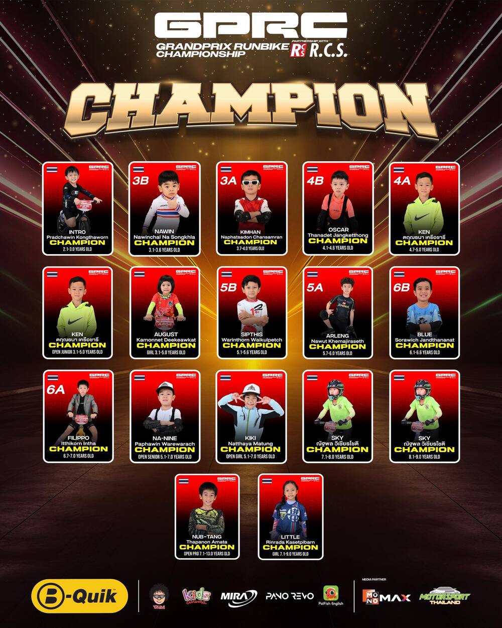 ตลอดปีการแข่งขัน Grandprix Runbike Championship 2025 ได้ผ่านการขับเคี่ยวอย่างเข้มข้นจากเหล่านักกีฬาขาไถเยาวชนตัวจิ๋ว โดยจัดการแข่งขันรวมทั้งสิ้น 4 อีเว้นท์ 8 สนาม ซึ่งแต่ละสนามล้วนเต็มไปด้วยความท้าทาย ความเร็ว และพัฒนาการของนักแข่งตัวน้อยที่เพิ่มขึ้นอย่างเห็นได้ชัดในทุกสนามการแข่งขัน บรรยากาศการแข่งขันในแต่ละอีเว้นท์เต็มไปด้วยความคึกคักจากนักแข่ง ผู้ปกครอง และกองเชียร์ ที่ร่วมกันสร้างสีสันให้กับสนามอย่างอบอุ่นและเปี่ยมด้วยพลัง ไม่เพียงเป็นการประชันฝีมือด้านทักษะการทรงตัวและความเร็วเท่านั้น แต่ยังเป็นเวทีแห่งการเรียนรู้ การปลูกฝังวินัย น้ำใจนักกีฬา และการพัฒนาศักยภาพของเยาวชนไทยตามมาตรฐานการแข่งขันระดับสากลของ Runbike Championship Series (R.C.S) ประเทศญี่ปุ่น