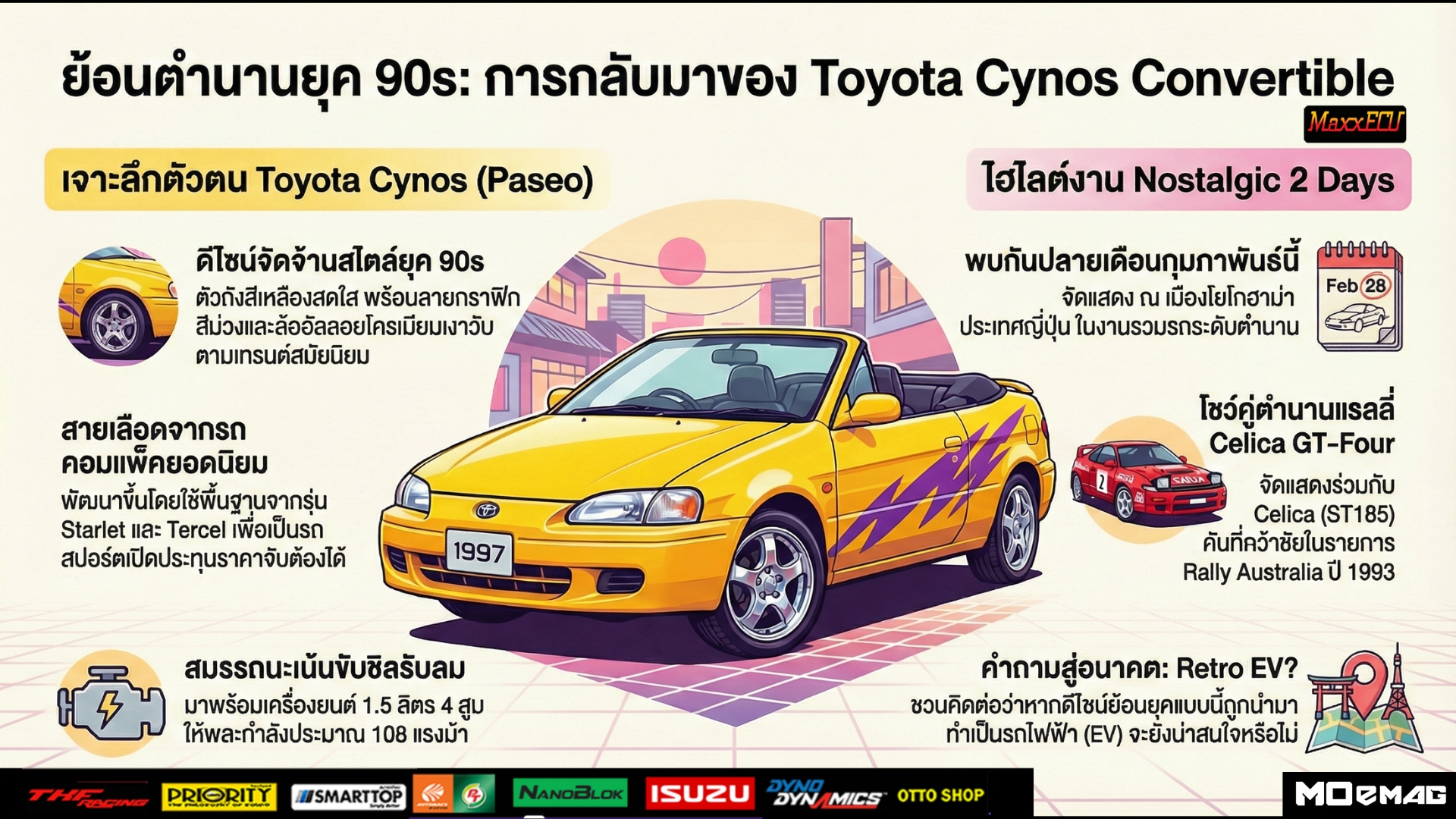 เรื่องของเรื่องคือ Toyota กำลังจะจัดแสดงรถหายากที่หลายคนอาจจะลืมไปแล้วอย่าง Toyota Cynos Convertible (หรือที่ฝั่งยุโรป/อเมริกาคุ้นในชื่อ Toyota Paseo) ในงาน Nostalgic 2 Days ที่โยโกฮาม่า ประเทศญี่ปุ่น ช่วงปลายเดือนกุมภาพันธ์นี้ครับ