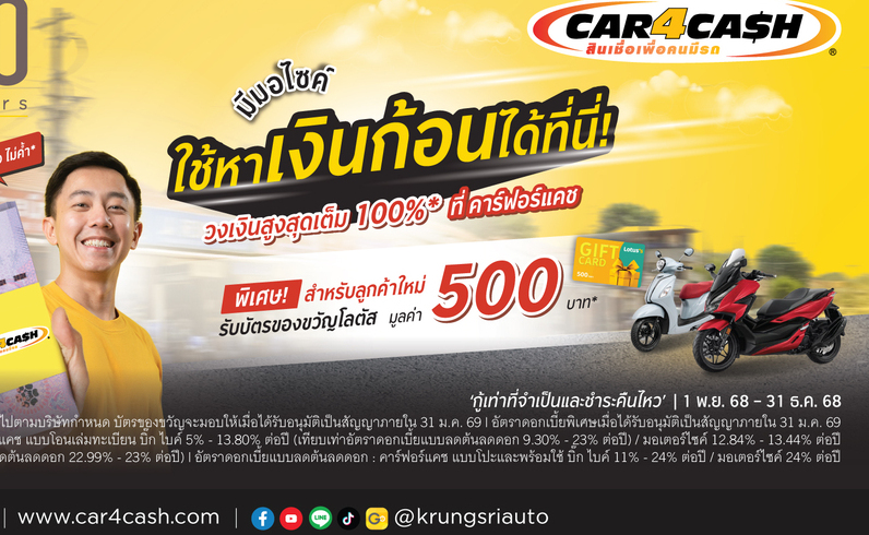 อ่านต่อ“คาร์ฟอร์แคช” เสริมสภาพคล่องผู้ใช้รถบิ๊ก ไบค์ และมอเตอร์ไซค์ รับเงินก้อนกั...