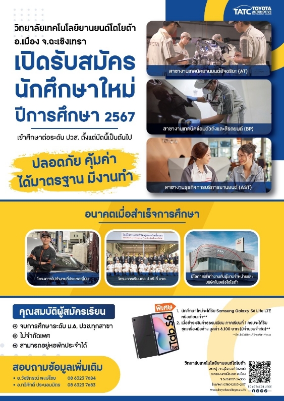 ข่าวดีสำหรับวัยรุ่นสร้างตัว วิทยาลัยเทคโนโลยียานยนต์โตโยต้า เปิดรับนักศึกษา...
