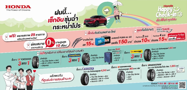 อ่านต่อฮอนด้า ออกแคมเปญ ฝนนี้…เช็กอินชุ่มฉ่ำ กระหน่ำโปรฯ ตรวจสภาพรถฟรี 25 รายการ ...