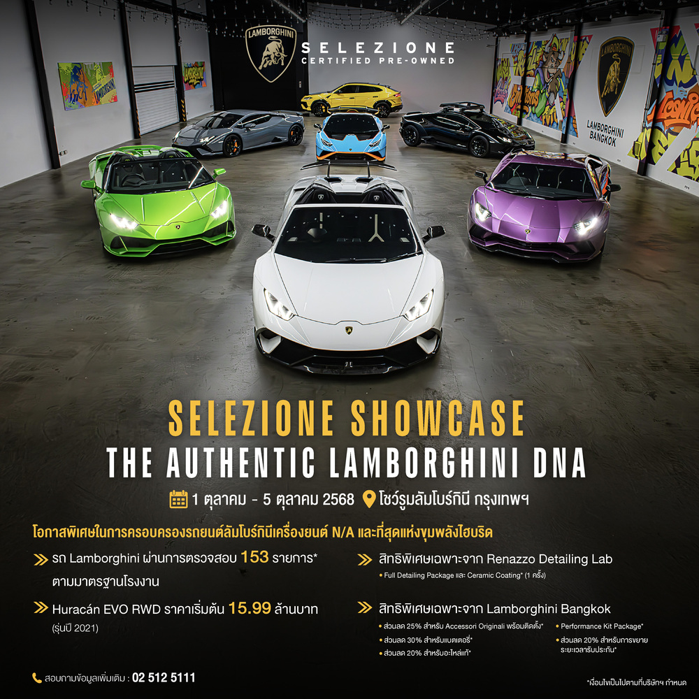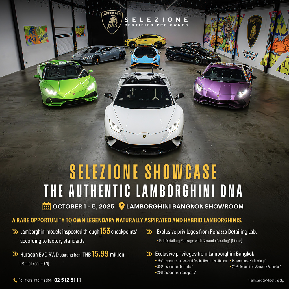 สำหรับแฟนพันธุ์แท้ค่ายวัวกระทิงดุเตรียมพบกับรถลัมโบร์กินีหลากหลายรุ่น อาทิ Aventador Ultimae, Huracan STO, Huracan Evo, Huracan Tecnica และ Urus Performante ระหว่างวันที่ 1-5 ตุลาคม 2568 ณ โชว์รูม เรนาสโซ มอเตอร์ ถนนวิภาวดีรังสิต