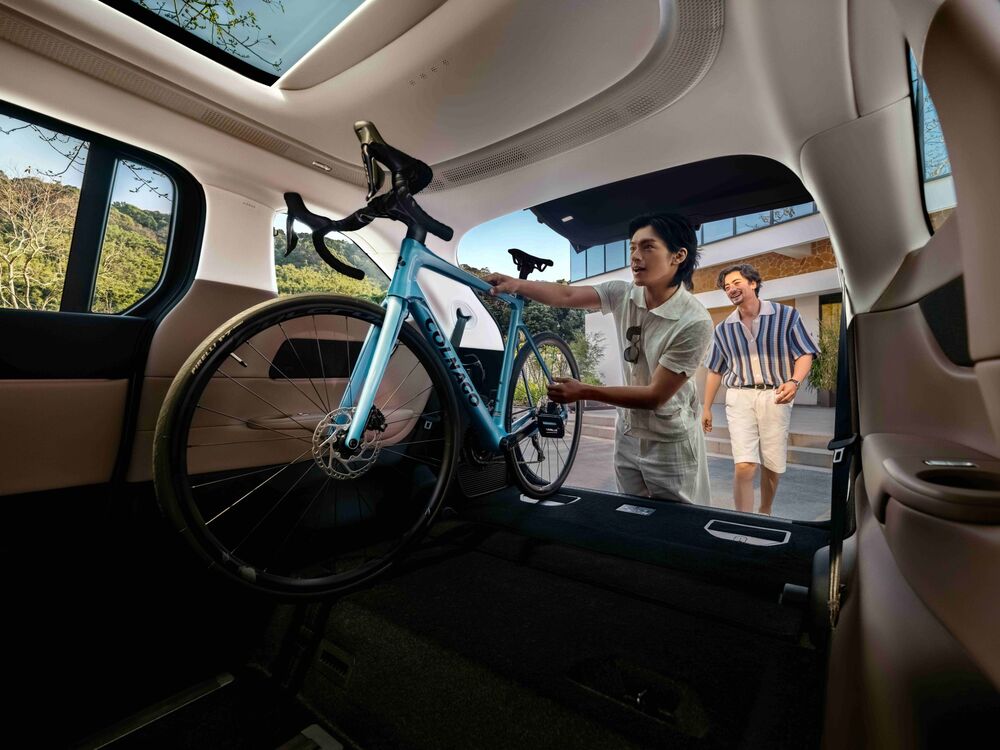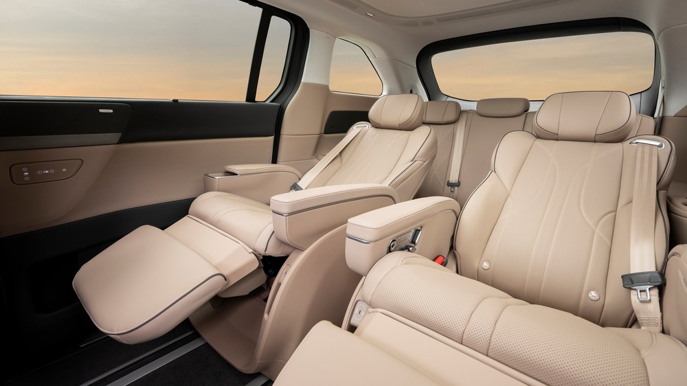 และช่องทางเดินระหว่างเบาะแถวที่สอง รวมถึงที่ชาร์จแบบไร้สาย หนึ่งเดียวในคลาสที่เบาะแถวสามสามารถพับราบด้วยไฟฟ้าเพียงหนึ่งสัมผัส และเทคโนโลยีเลี้ยว 4 ล้อ รัศมีวงเลี้ยวเพียง 5.4 เมตร นับว่าเป็นรถตู้ไฟฟ้าที่คล่องตัวที่สุดเท่าที่เคยมีมา อีกทั้งยังผสานการขับเคลื่อนด้วยเทคโนโลยีแบตเตอรี่ 800 โวลต์ ที่สามารถชาร์จไฟจาก 10%–80% ได้ในเวลาเพียง 20 นาที รองรับความเร็ว